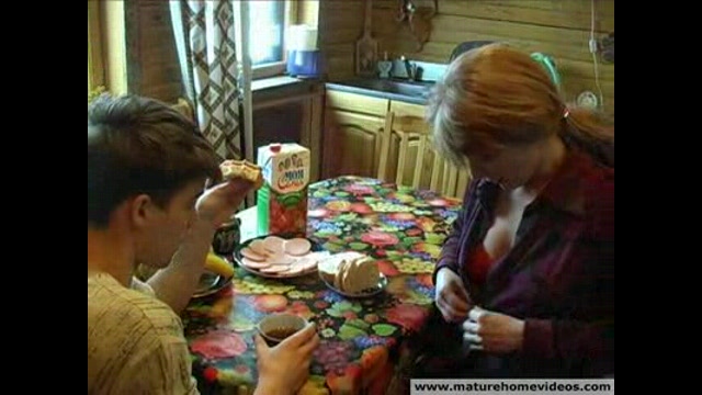 Ненасытная баба накормила своего взрослого сына, а в благодарность за это женщина захотела, чтобы паренек ее потрахал по полной программе.
